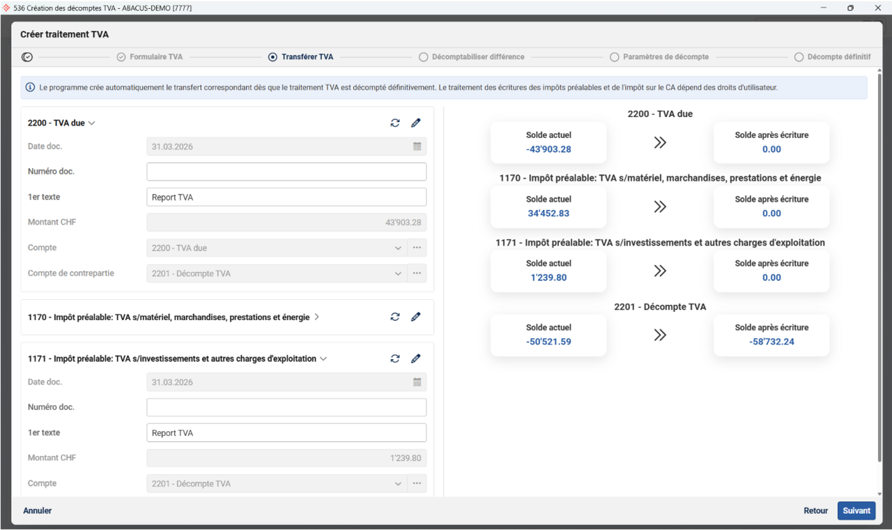 L'étape "Transférer TVA" propose les montants transférés pour les comptes impôts définis, et simule l'évolution du solde à la fin de la période de TVA. Les propositions peuvent, le cas échéant, être remplacées manuellement.