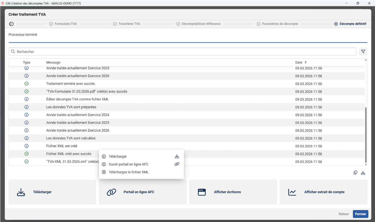 Une fois le traitement TVA créé avec succès, il sera notamment possible de télécharger le fichier xml pour le portail en ligne de l'AFC et de le soumettre manuellement. Les fichiers TVA (Liste de contrôle, Décompte et Formulaire) peuvent également être téléchargés. Les fichiers seront automatiquement classés dans le gestionnaire archives/dossiers. Pour vérifier les écritures créées, il est possible d'afficher directement ces écritures ou l'extrait de compte.