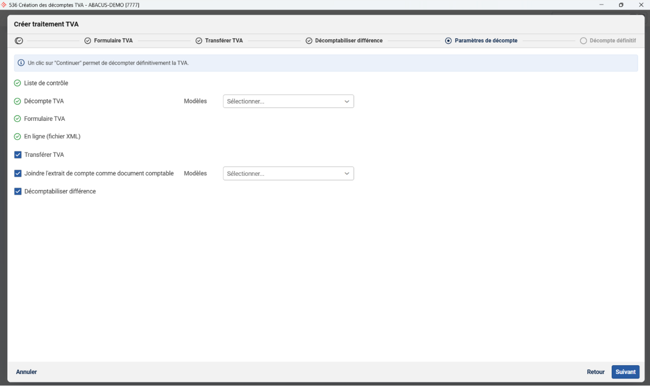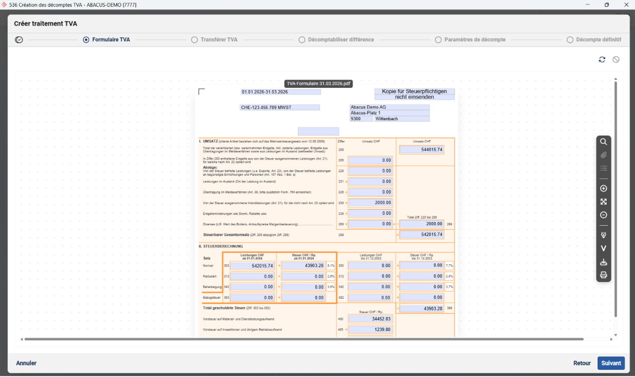 Le processus "Créer traitement TVA" prépare progressivement les rapports Liste de contrôle, Décompte et Formulaire, avant de générer la proposition de transfert. Le "passage rapide" mène directement à la proposition de transfert.