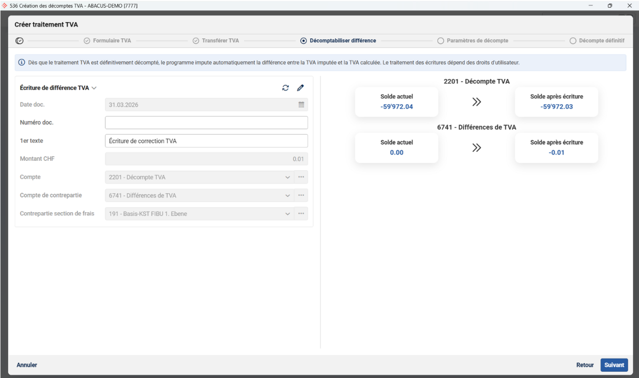 Les éventuelles différences (d'arrondi) entre l'impôt sur le CA comptabilisé et calculé sont indiquées et peuvent également faire l'objet d'un transfert automatique ou d'une modification ultérieure.