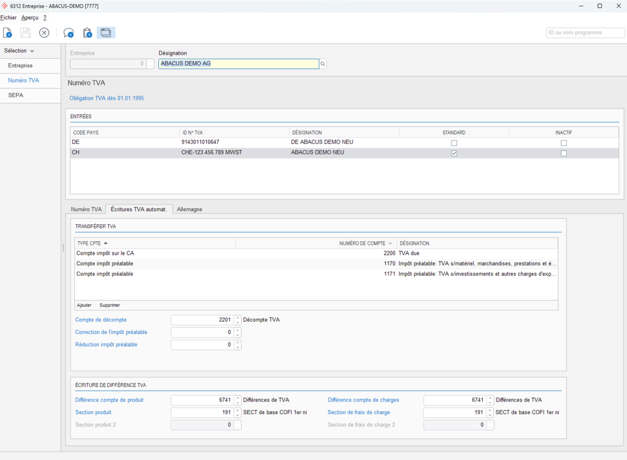 Pour commencer, il faut configurer une seule fois les comptes pour les écritures automatiques de la TVA dans le programme F6312 "Entreprise" sous le numéro TVA. Un nombre illimité de comptes de chiffre d'affaires ou de comptes d'impôt préalable peut être défini.
