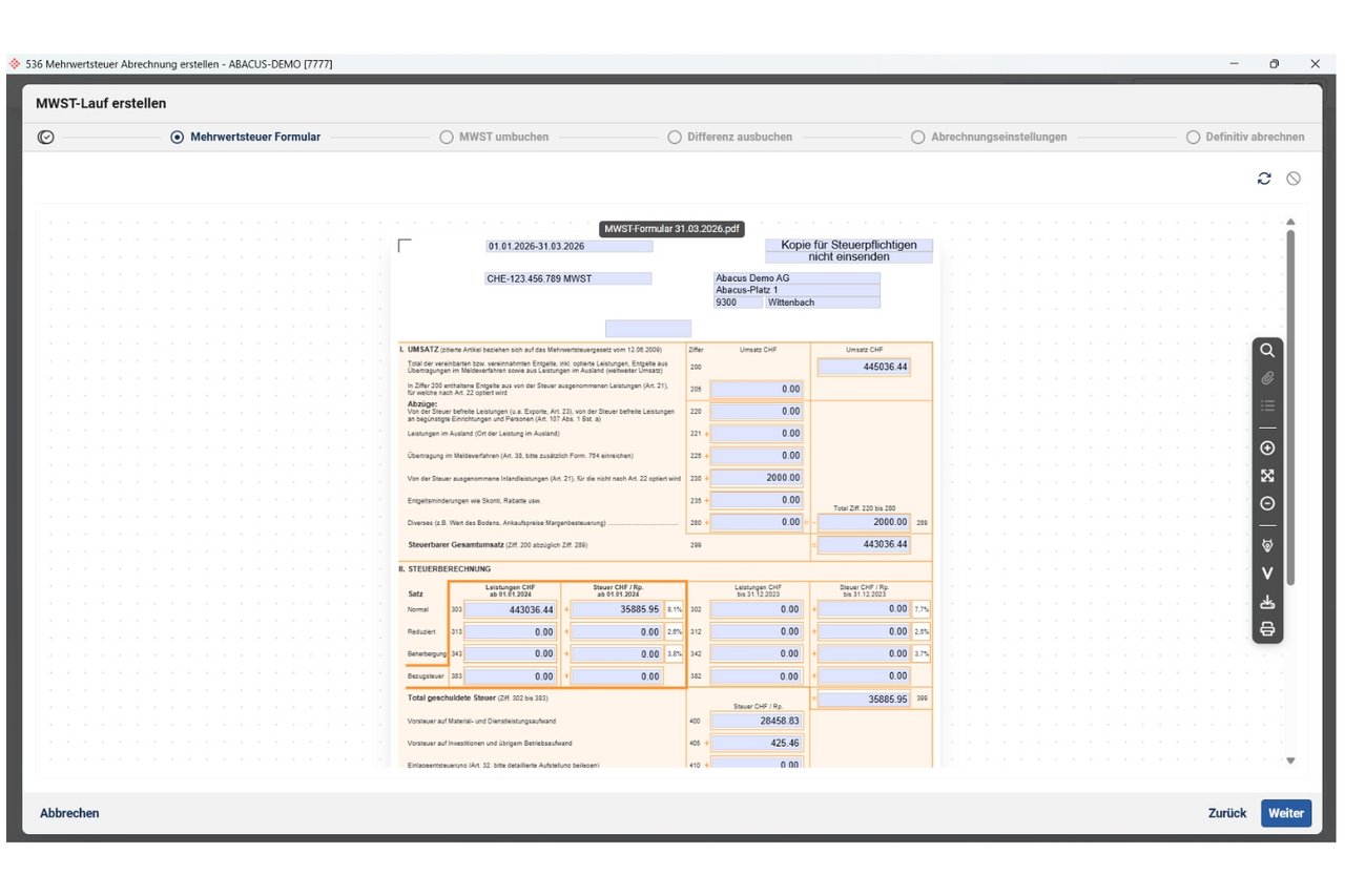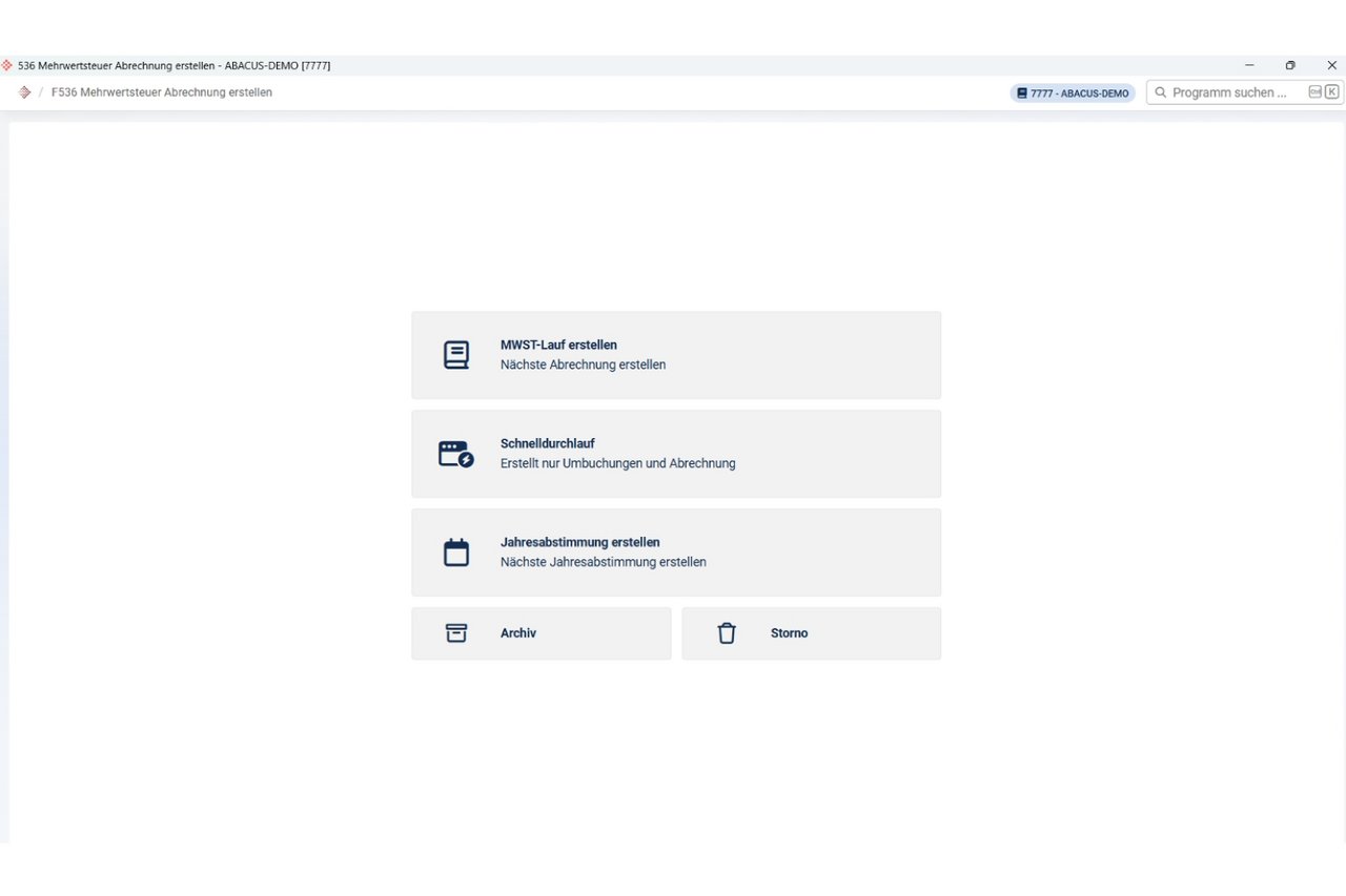 Das Programm F536 «Mehrwertsteuer Abrechnung erstellen» führt Schritt für Schritt durch den MWST-Abrechnungsprozess und automatisiert die Umbuchungen – ab v2026 mit erweitertem Funktionsumfang und neu in der Browser Edition.