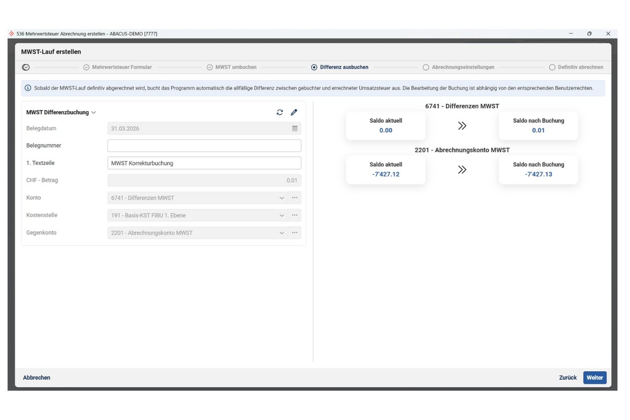 Allfällige (Rundungs-)Differenzen zwischen der gebuchten und errechneten Umsatzsteuer werden nachgewiesen und können ebenfalls automatisch umgebucht resp. noch übersteuert werden.