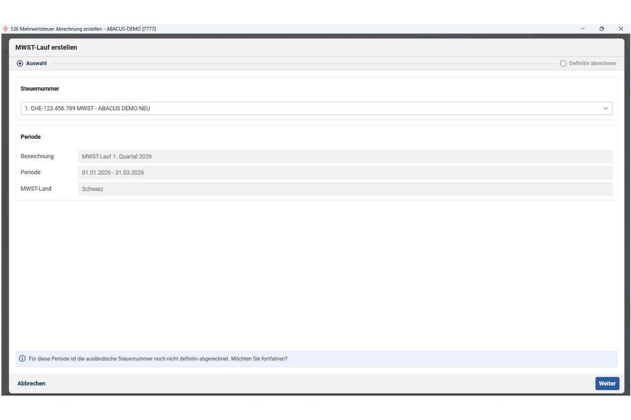 Anschliessend werden die abzurechnende Steuernummer und Periode vorgeschlagen.