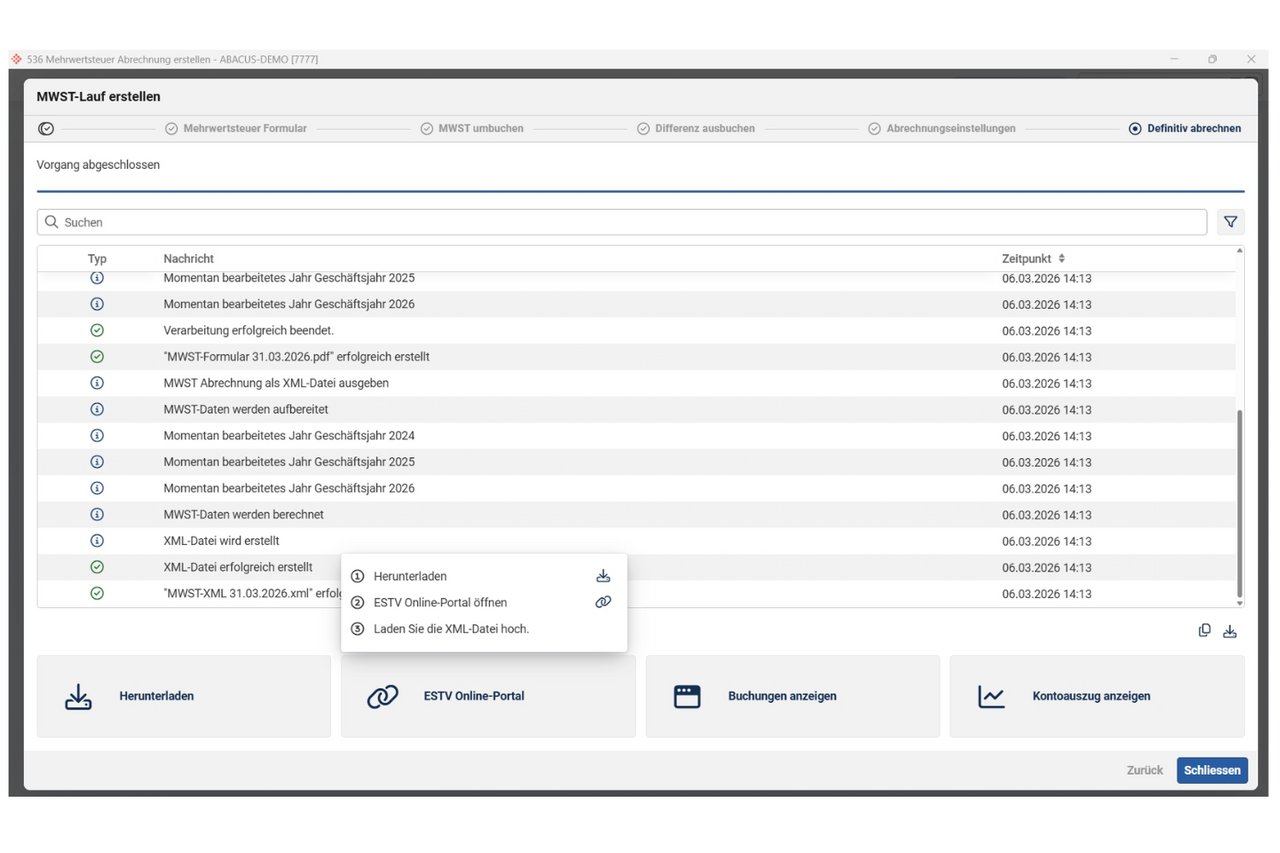 Wenn der MWST-Lauf erfolgreich erstellt worden ist, kann insbesondere die xml-Datei für das ESTV Online-Portal heruntergeladen und manuell eingereicht werden. Zudem können die MWST-Dateien (Verprobung, Abrechnung und Formular) heruntergeladen werden. Die Dateien werden auch automatisch im Archiv / Dossiermanager abgelegt. Für die Kontrolle der erstellten Buchungen können direkt die Buchungen oder der Kontoauszug angezeigt werden.