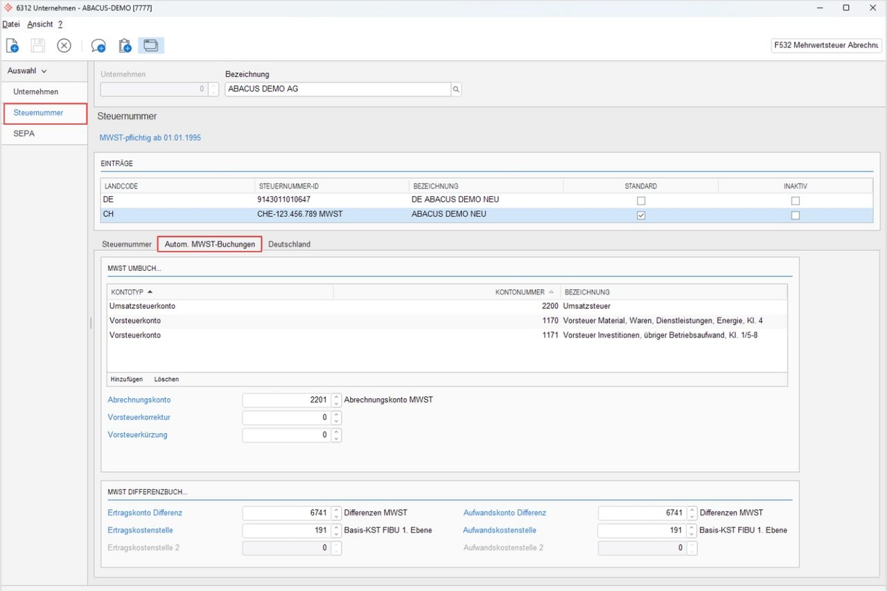 Als Basis müssen einmalig im Programm F6312 «Unternehmen» auf der Steuernummer die Konti für die automatische MWST-Buchungen eingerichtet werden. Es können beliebig viele Umsatz- oder Vorsteuerkonti definiert werden.