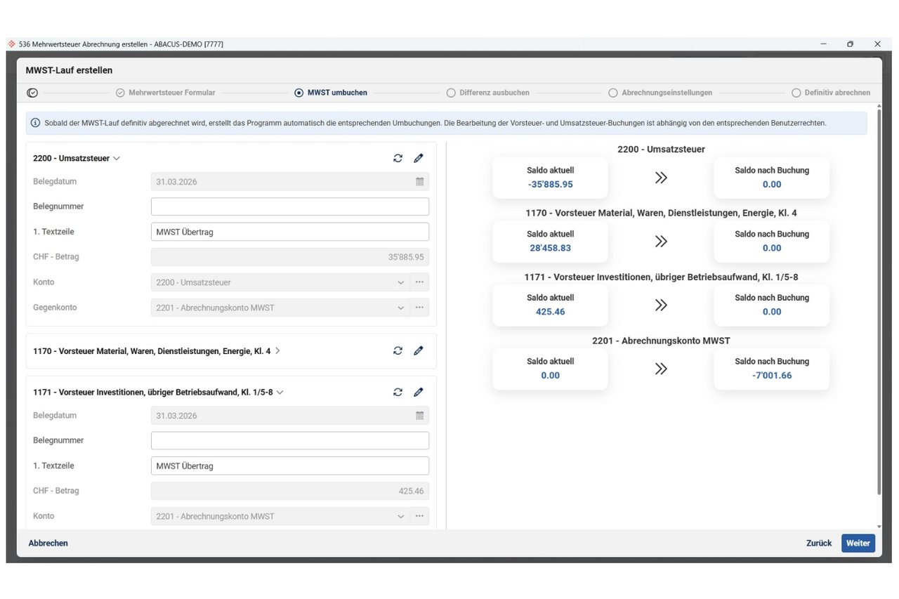 Der Schritt «MWST umbuchen» schlägt für die definierten Steuerkonti die Umbuchungsbeträge vor und simuliert den Saldoverlauf Saldoanzeige per Ende der MWST-Periode. Die Vorschläge können allenfalls noch manuell übersteuert werden.
